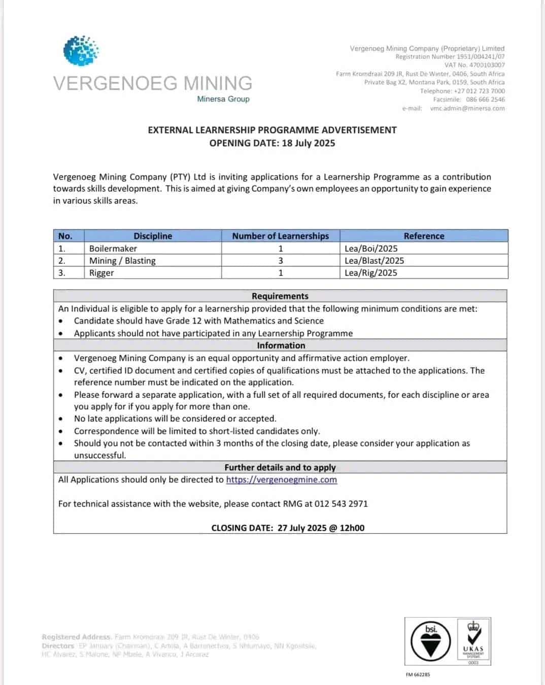 DOWNLOAD THE VERGENOEG MINE LEARNERSHIP PROGRAMME ADVERT HERE